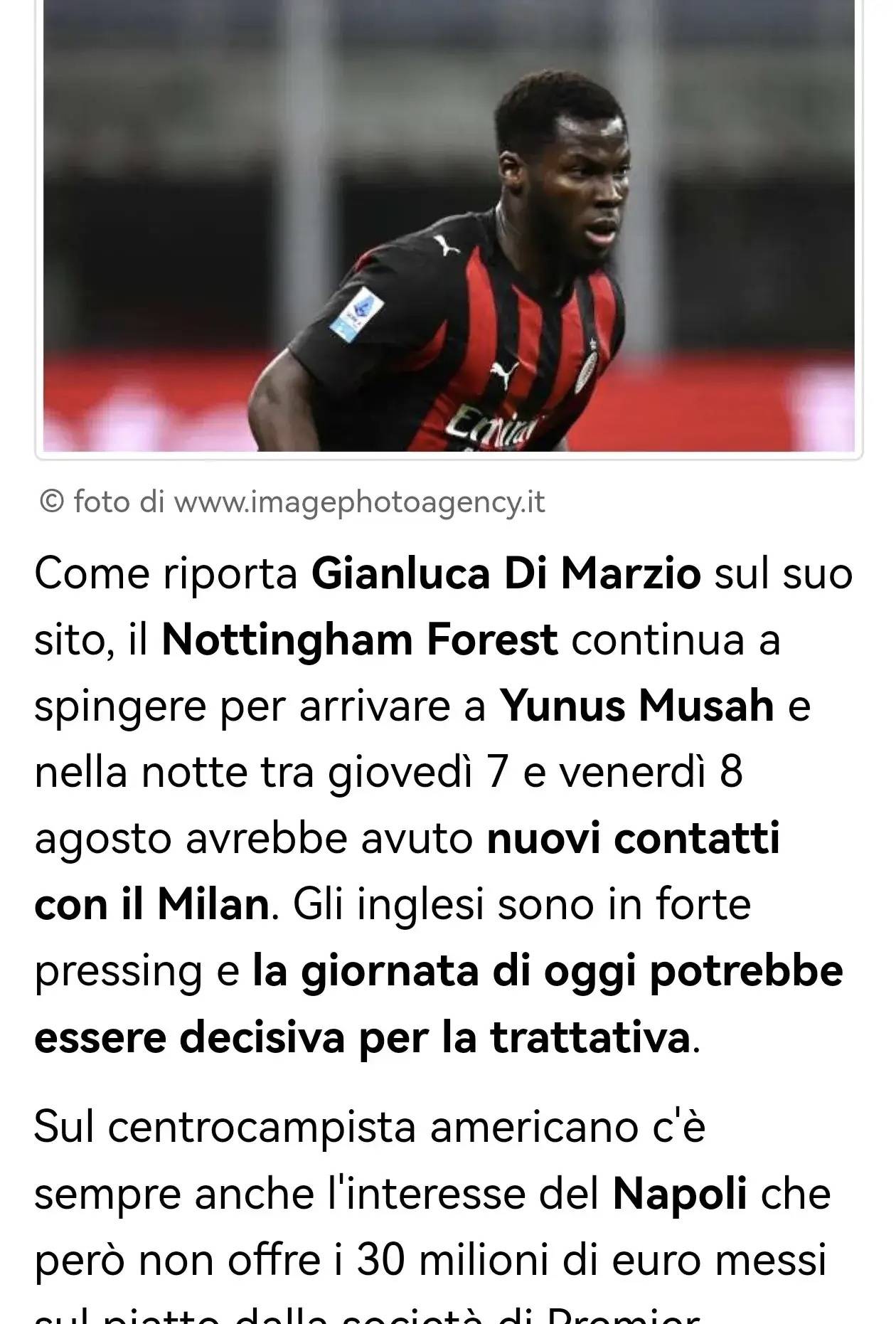 正如詹卢卡·迪马济奥说的那样,诺丁汉森林仍在全力争取尤努斯·穆萨,在8月7日(周四)至8日(周五)的夜间,该队与米兰进行了新的接触。