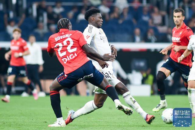 ↑皇家马德里队球员楚阿梅尼(前右)和奥萨苏纳队球员博约莫在比赛中拼抢。
