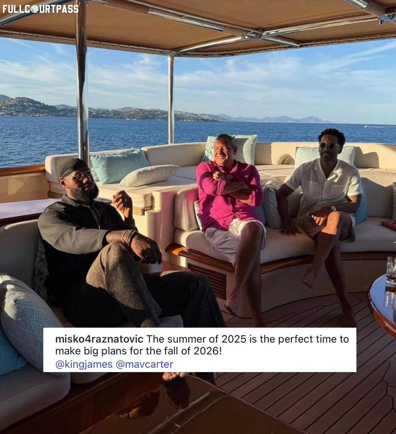 根据BasketNews的报道,一次船上旅程在社交媒体上引发了人们对NBA巨星勒布朗·詹姆斯可能加盟掘金的猜测。上周六,尼古拉·约基奇的长期经纪人米斯科·拉兹纳托维奇分享了一张他与詹姆斯及其商业伙伴马弗里克·卡特在圣特罗佩合影的照片,并附文说:“2025年夏季是为2026年秋季制定雄心勃勃计划的最佳时机!”@kingjames,@mavcarter。