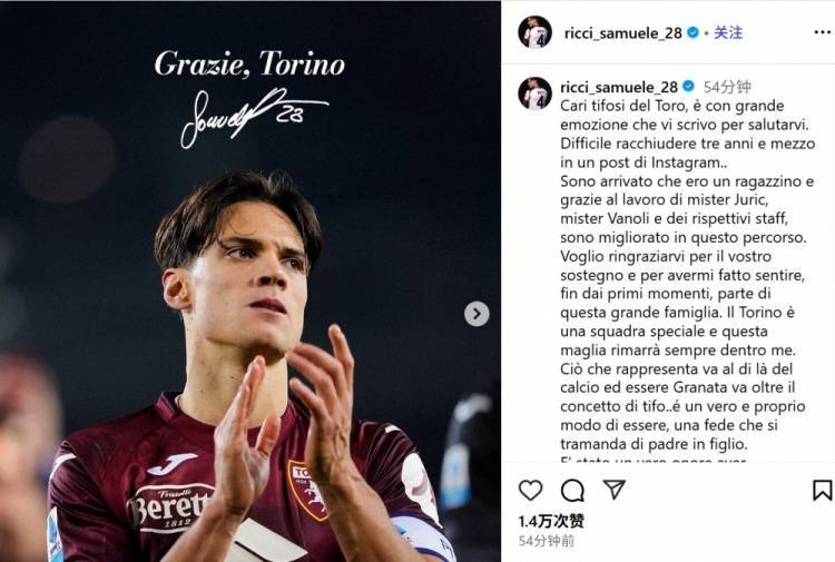 直播吧7月5日讯 米兰已经官宣签下23岁中场里奇,后者也通过社媒撰文告别都灵: